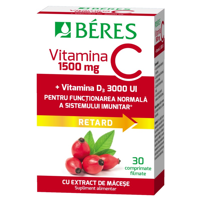Beres Vitamina C 1500 mg + Vitamina D3 3000 UI Retard, 30 comprimate filmate este un supliment alimentar din grupa vitamine, contine ingrediente active Vitamina C (acid ascorbic), Vitamina D si poate fi administrat la recomandarea medicului sau farmacistului.