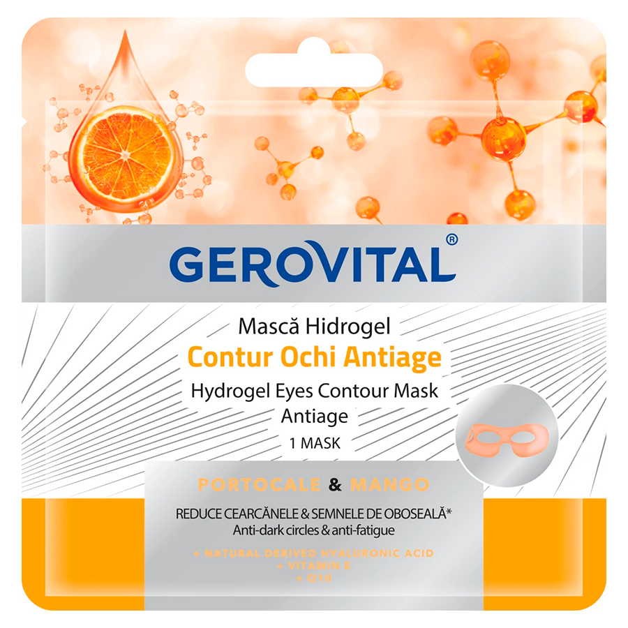 Gerovital Masca Hidrogel Contur Ochi Anti-Age este o masca faciala tip servetel, un produs inovator pentru tratamentul conturului ochilor. Aceasta masca pentru ten este realizata cu tehnologia DermoScience Cryo Effect, un hidrogel special care contine acid hialuronic, cu trei greutati moleculare diferite, suc de Portocale, Extract de Mango, Vitamina E si Coenzima Q10.