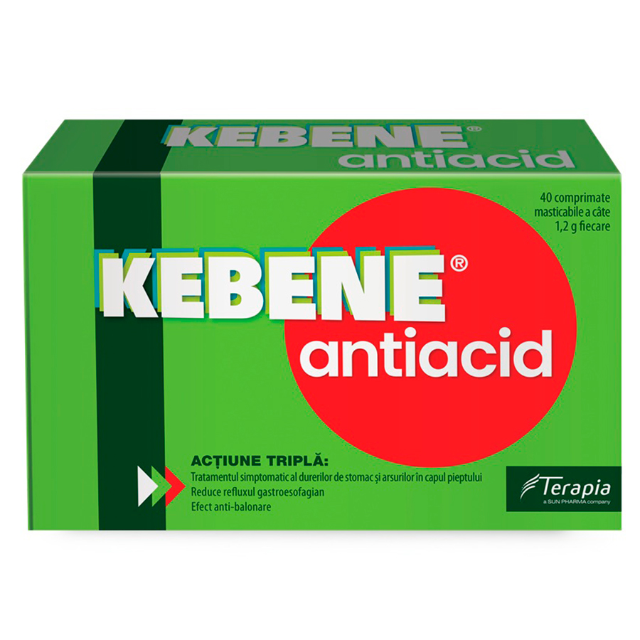 • KEBENE ANTIACID este indicat pentru tratamentul arsurilor si durerilor gastrice cauzate de aciditatea in exces (reduce hiperaciditatea gastrica). Produsul este, de asemenea, util in tratarea simptomelor asociate refluxului gastroesofagian si dispepsiei (precum dificultati de digestie, arsuri gastrice, durere si senzatie de arsura in zona pieptului, senzatia de plenitudine imediat dupa masa).