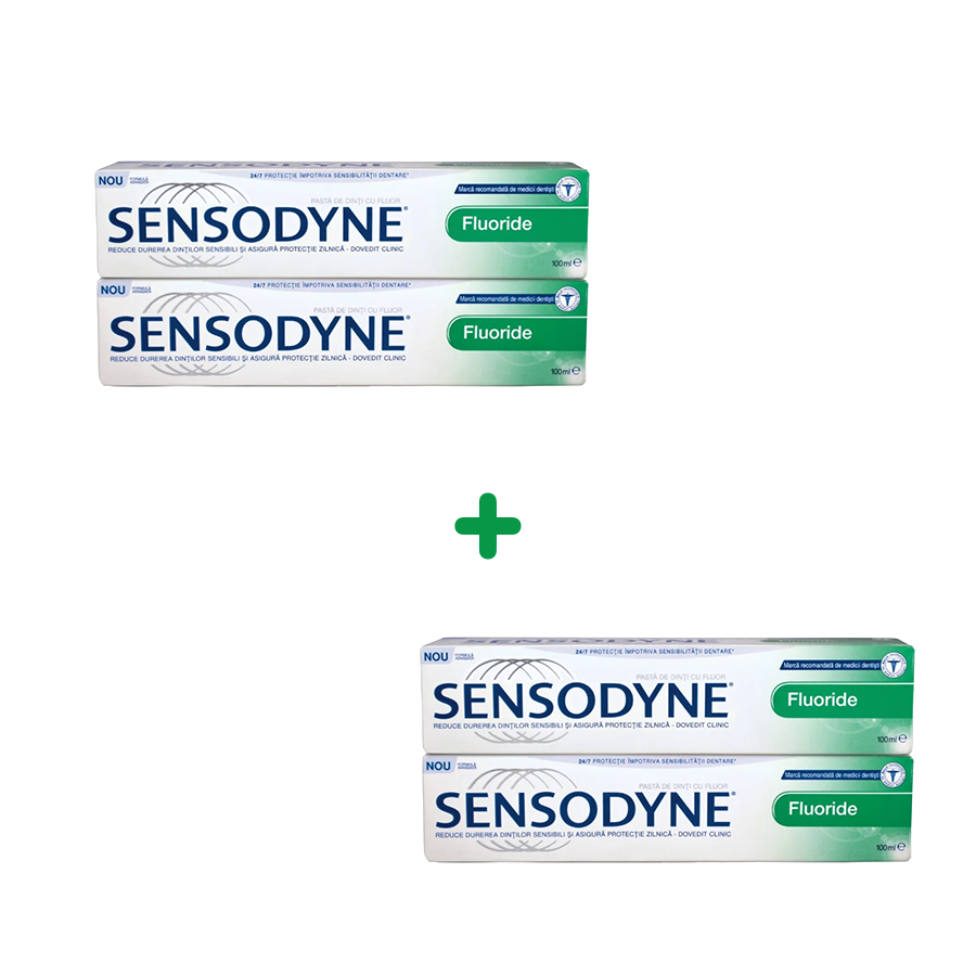 Cumpara pachetul Sensodyne Fluoride pasta de dinti, 100 ml DUO PACK si primesti a-2 a cutie gratuit. Campania este valabila in perioada 01-31.12.2025, in limita stocului disponibil.