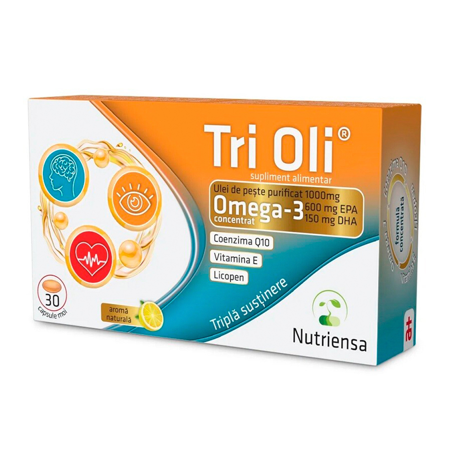 Printr-o selectie atenta a ingredientelor Tri Oli® asigura mentinerea sanatatii cardiovasculare, oculare si cerebrale. Asocierea acizilor grasi Omega-3, respectiv EPA si DHA, cu vitamina E, coenzima Q10 si licopen sustine si accelereaza procesele antioxidante, energetice si reparatorii ale celulelor, in special la nivelul inimii, creierului si ochilor.